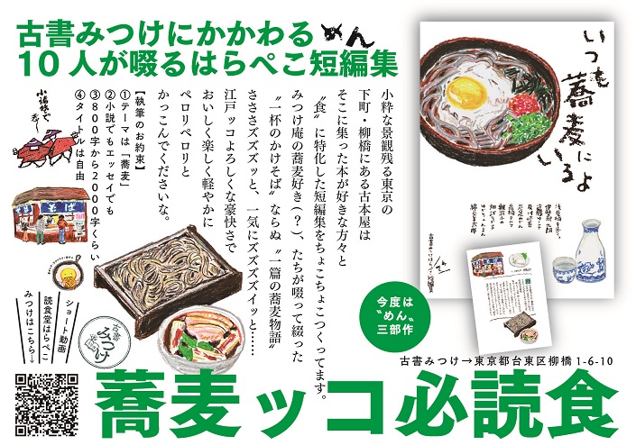 古書みつけがおくる、はらぺこ短編集、これまでに「おなかすいたなぁ」「おいしそうだなぁ」「ごちそうさまでした。」と、食をテーマとした三部作を刊行してきましたが、おかげさまでたいへんご好評につき、続いて、はらぺこ〝めん〟短編集と題して、「蕎麦」「スパゲティ」「ラーメン」の三部作をつくっていくことになりました。